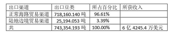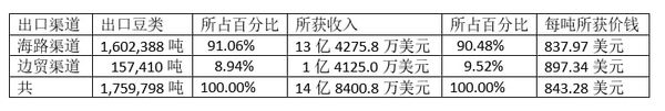 两个出口渠道中,海路渠道占主要地位,9成以上的豆类都是由海路出口,由边贸出口的豆类占不到1成。而就所获收入比例来看,海路占了90.48%的比例,不及出口重量的比例。究其原因,是因为海路出口时,每吨豆类获得837.97美元,而由边贸出口时,每吨所获价钱为897.34美元。