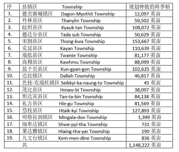 另外在仰光省全省的19个县镇区中,各县镇区规划种植的雨季稻面积如下表: