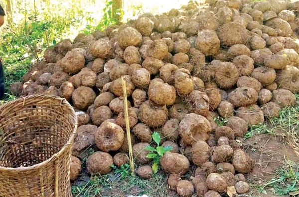 挖掘魔芋是会得到地底下 的小块茎,还有在叶子间生长出来的叶间果。种植地下的块茎容易发生腐烂、虫害等现象,所以在自己园林里是以叶间果为种进行种植。以块茎为种种植的话2年就可以挖掘出产品,以叶间果为种3年可挖掘出果实。魔芋不喜树荫,所以不能在多年生果树园林中作为间种作物来种植,需要专门在农田中种植。本人自5年前开始种植10英亩的魔芋作物,每年挖掘3英亩田地的魔芋,每英亩产量在1,000至1,500缅斤(1缅斤约等于1.6公斤)之间,魔芋1缅斤可售得800至1,000缅元,所以一年约可获得280万缅元,增加了家庭的收入经济生活也顺利得多了,种植此魔芋的农妇Daw Nila这样介绍其种植此魔芋作物的经历。