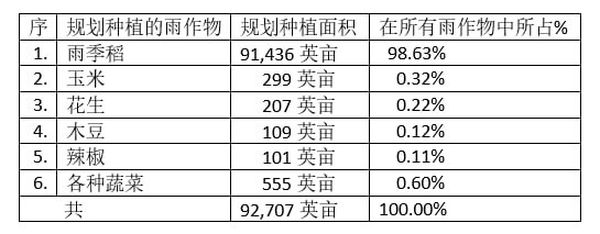 在各种规划种植的雨作物中,雨季稻当然占最主要地位,其种植面积就占了全部雨作物种植面积的近99%的比例。
