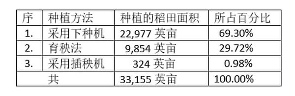 在现在完成种植工作的稻田中,有采用下种机种植的,也有采用育秧法种植的,也有采用插秧机种植的,各种植方法所种植的稻田面积如下: