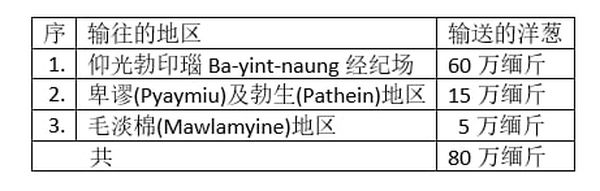 这7月份期间输送出的洋葱达80万缅斤,等于1,306吨。这当中输送往仰光勃印瑙交易场的洋葱为最多。而出口方面,则是通过毛淡棉出口到了泰国与越南等国家。