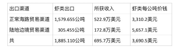 缅甸水产品出口到中国、泰国、日本等40多个国家和地区,这样出口时,有由正常海路贸易渠道出口,也有由陆地边境贸易渠道出口,现在虾类由海路出口时每公吨所获价钱为3,310.2美元,由边贸出口时每公吨所获价钱为5,657.1美元,为什么会有这样的差距,是虾类品种不同,还是其他原因,这是值得探讨的一个课题了。