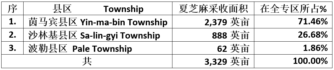 茵马宾专区的4个县区中,甘尼(Kani)县区完全没种植这夏芝麻。茵马宾县区种植的夏芝麻则占了全专区种植面积的三分之二以上。现在采收工作完毕,平均每英亩芝麻产量达到18.08缅箩,接近每英亩20缅箩的指标产量。