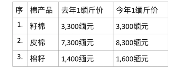 现在采收时每英亩棉花产量在400—500缅斤(1缅斤约等于1.6公斤);种植费用方面,包括种籽、投资物件及人工费等在内,每英亩约需30万缅元。棉产品方面,今年籽棉(未经处理的棉花)价钱没变化,皮棉(已去掉棉籽的棉花)价钱却上扬了。各种棉产品的价钱如下: