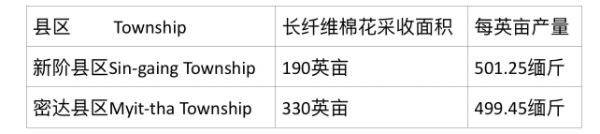曼德勒省皎栖(Kyauk-se)专区内的皎栖县区、新阶(Sin-gaing)县区及密达(Myit-tha)县区这3个县区在今年夏作物种植季节期间种植了长纤维棉花13,397英亩。