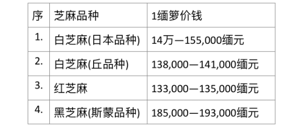 盈利方面,黑芝麻1英亩可获得147万缅元,白芝麻(日本品种)1英亩93万缅元,白芝麻(丘品种) 1英亩906,000缅元,黑芝麻1英亩846,000缅元。