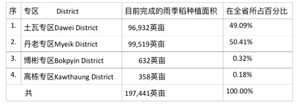 另据8月21日出版的《苗瓦底报》报导,德林达依省4个专区中,目前各专区所完成的雨季稻种植面积分别如下: