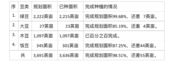 今年雨季格礼县区规划种植的各种豆类面积及目前完成的种植面积如下表: