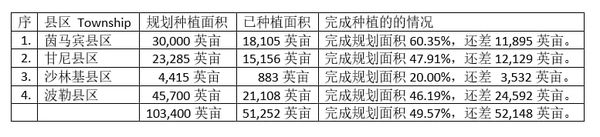 四个县区中,不论是规划种植面积,还是已完成的种植面积,都以波勒县区为最多,而茵马宾县区为次之。