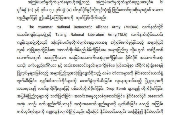 通告中表示,缅甸民族民主同盟军(MNDAA)、德昂民族解放军(TNLA)、若开军(AA)违反《反恐怖主义法》,对人民生命安全、财产安全造成威胁;毁坏个人或国家重要基础设施;炸毁公共设施道路、桥梁、电塔等;用重型武器从远处攻击人口稠密的城镇和村庄;通过无人机投掷炸弹进行攻击;杀害无辜百姓等恐怖行为。