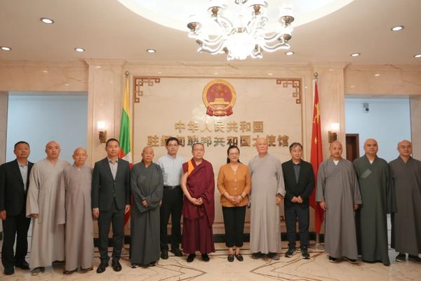 9月3日,北京市佛教协会会长、雍和宫住持胡雪峰大喇嘛率北京佛教代表团到访缅甸,中国驻缅甸大使马珈会见代表团一行。双方就巩固中缅佛教传统法谊、促进两国民心相通深入交换了意见。李千国参赞等参加活动。