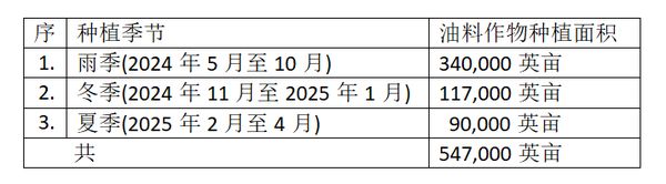 该油料作物第一特区内将种植花生、芝麻及向日葵这三种油料作物,在今年雨季将种植34万多英亩,冬季将种植117,000英亩,来年夏季时将种植9万多英亩,共54万多英亩。