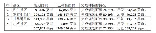 今年勃生专区内的四个县区,勃生县区、额布都(Nga-pu-taw)县区、甘基道(Kan-gyi-daut)县区及达榜(Tha-baung)县区四个县区规划种植的雨季稻面积及目前完成的雨季稻种植面积如下表: