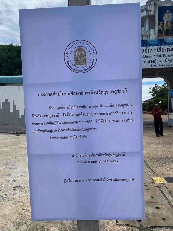 据素叻他尼府教育局于9 月4 日发布的通知,“密达晔”缅文学校(မေတ္တာရိပ်)没有根据泰国2017年《私立学校法》设立和施工许可证的情况下运营,要求暂停,并正在采取法律行动。