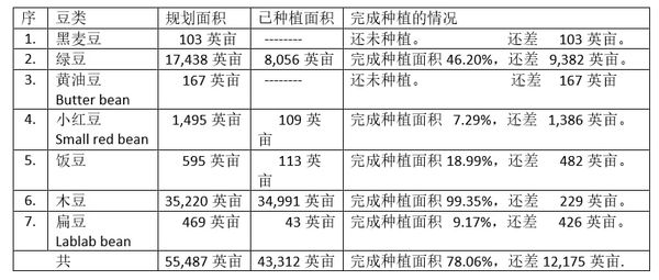 规划种植的各种豆类中,以木豆的规划种植面积为最多,其次是绿豆。已种植的面积中,也是这两种豆类为最多。