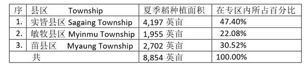 今年实皆专区在夏作物种植季节期间种植的夏季稻,自今年5月开始有关收割工作,在实皆、敏牧(Myinmu)及苗(Myaung)三个县区共完成了这夏季稻8,854英亩的收割工作,平均每英亩稻谷产量为87.81缅箩。
