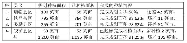 现财政年度瑞帽专区各县区规划种植的雨向日葵面积及目前完成的种植面积如下表: