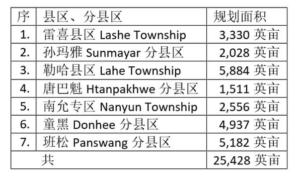 目前那加民族自治区内各县区完成的雨季稻种植面积如下表: