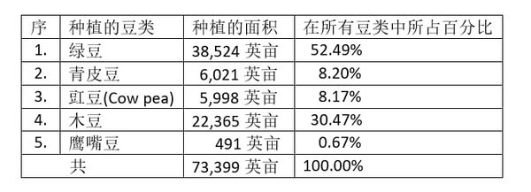 已完成种植工作的豆类中,以绿豆种植面积为最多,占了所有豆类种植面积的一半以上。其次是木豆,种植面积占所有豆类种植面积的三成以上。