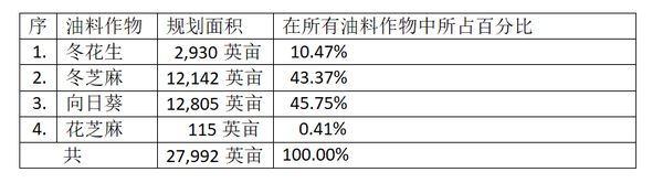 在这冬作物种植季节期间规划种植的油料作物共为27,992英亩,其中以向日葵种植面积为最多,冬芝麻种植面积为第二。