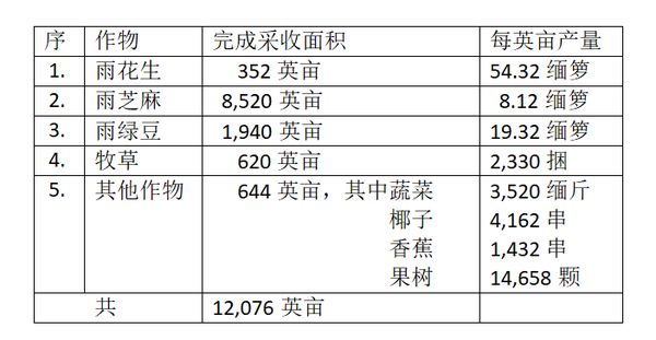 目前本漂县区方面完成采收工作的各种雨作物及收成情况如下表: