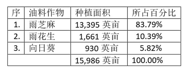 规划种植面积中,以芝麻种植面积为最多,占了全部油料作物种植面积的五分之四以上,而花生种面积只占十分之一多。现在实际种植面积大大超过规划种植面积,估计也是芝麻占大多数。