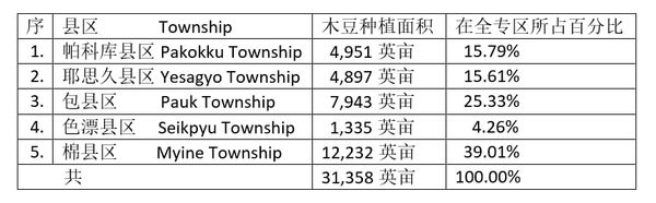 据9月12日出版的《缅甸之光报》报导,马圭省帕科库专区每年都种植木豆,今年雨季专区内的各县区也都种植了这木豆作物,全专区木豆种植面积达到31,358英亩,而各县区所种植的木豆面积如下表: