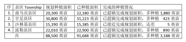 茵马宾专区内的四个县区为:茵马宾县区、甘尼(Kani)县区、沙林基(Salingyi)县区及波勒(Pale)县区,各县区原规划的木豆种植面积及目前所完成的种植面积如下表:
