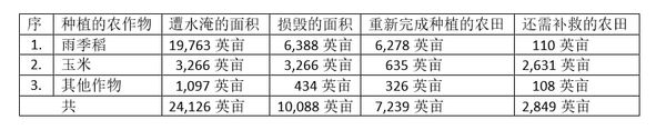 这些还需要重新补救种植的农田中包括雨季稻110英亩,玉米2,631英亩及其他作物108英亩,这些农田将在本月底内全部完成重新种植工作。