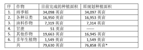 前几天媒体报导时遵纳县区雨季稻种植工作还没全部完成,现在却已完成有关种植面积并多种植1英亩。各种豆类种植面积比规划种植面积少3英亩,但油料作物却多种植5英亩。而其他作物多种植了2,718英亩。