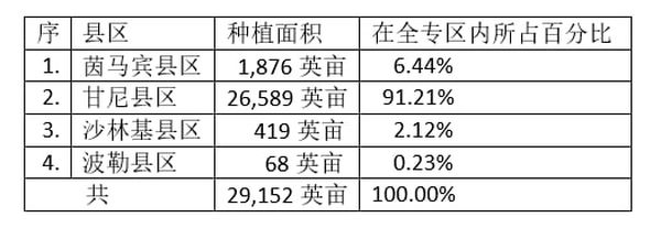 专区内的4个县区中,以甘尼县区种植面积为最多,其雨花生种植面积占了全专区种植面积的九成以上。