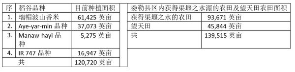 “委勒县区今年规划种植雨季稻139,000多英亩,目前已完成120,720英亩的种植工作。委勒县区内主要种植的稻谷品种有Aye-yar-min、瑞帽(Shwebo)波山(Pawsan)香米、IR 747及Manaw-hayi等。在水源有保障的渠堰供水地区中就以种植Ayeyarmin及瑞帽波山香米为主,望天田就以种植IR 747及Manaw-hayi为主了。”委勒县区县农业局负责人Daw Kyin San这样介绍道。