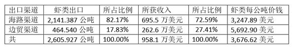 这样出口时,海路渠道出口占了较大的比例。但边贸渠道出口的虾类重量不到总出口量的五分之一,但所获收入却占总收入的 ¼ 以上。造成这样的原因,就是所获价钱不同所致。海路出口时,每公吨虾只获3千多美元,而由边贸出口时,每公吨价钱却在5千美元以上。