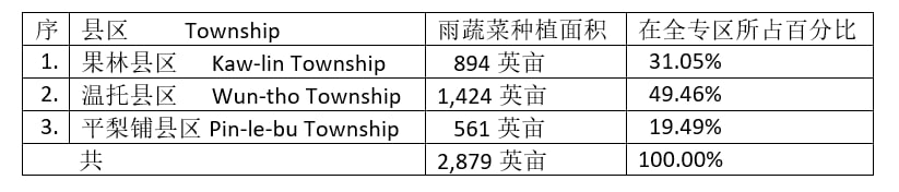 专区内的3个县区中,以温托县区这雨蔬菜种植面积为最多,其种植面积几乎占了全专区种植面积的一半。