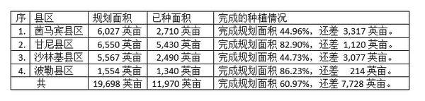 专区内的4个县区中,以甘尼县区规划种植面积为最多,而目前完成的种植面积也是最多。