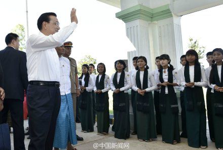 李克强抵达时,学生们挥舞中缅两国国旗,唱起校歌,热情欢迎中国总理到来。李克强走进一间高年级教室,学生们起立向他问好,并纷纷围拢过来。李克强询问他们的学习情况,并问他们愿不愿意去中国留学。学生们高兴地回答“愿意”。