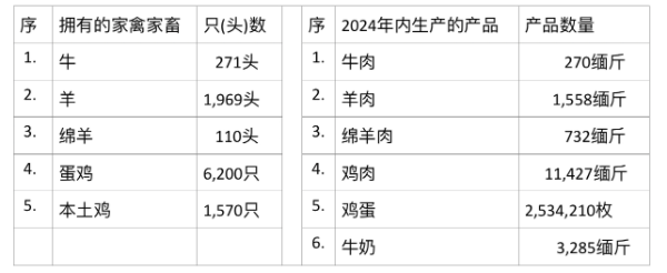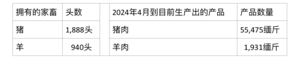 巴安县区内的Mi-zar养殖特区成立于2024年2月10日,目前拥有的家畜及今年肉类的生产情况如下(按:1缅斤约等于1.6公斤):