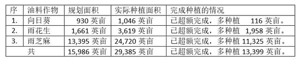 本漂县区方面,为提高地区油料作物种植能力,满足民众们对食用油的需求,在2024—25财政年度雨作物种植季节期间规划种植各种油料作物15,986英亩,实际种植时种植了这些油料作物29,385英亩,各种油料作物原规划种植面积及实际种植面积如下表:
