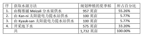 在这样种植时,县农业局将采用各种方法获取有关农业用水。这包括由渠堰提供水源,由太阳能电力提水,开采地下水等各种方法。各种方法所规划种植的夏季稻农田面积如下表: