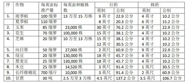 缅甸农业部对几种主要的作物:稻谷(有雨季稻与夏季稻)、玉米、花生、芝麻、向日葵、黑麦豆、绿豆、木豆、长纤维棉花及甘蔗这10种作物规定了指标产量。要达到这些指标产量,就要进行合理的密植,作物种植时行距及株距就有一定的要求了。文章中介绍这些指标产量,每英亩需种植的株数、行距及株距等如下: