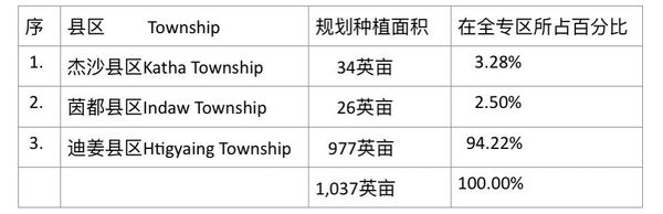 专区内的4个县区中,板卯(Banmauk)县区没规划种植此黑麦豆作物,剩下的3个县区中,也以迪姜县区规划种植的面积为最多,占了全专区黑麦豆种植面积的近九成五的比例。