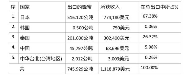 在这样出口时,主要出口到日本、韩国、泰国、中国及中华台北(台湾)等国家和地区,向各个国家地区出口的蜂蜜及所获得的收入如下表: