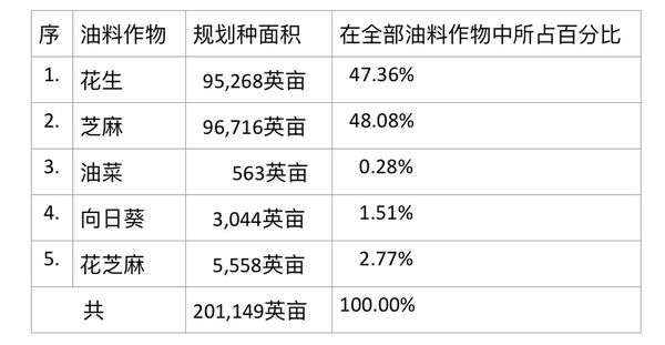 各种油料作物中,花生和芝麻的规划种植面积为最多,都在95,000英亩以上,两者合起来规划种植面积已达到全部油料作物规划种植面积的九成五以上的比例了。