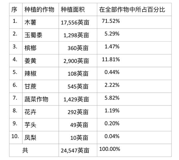 种植的各种作物中,以木薯种植面积为最多,占了所有作物种植面积七成以上的的比例,其次是姜黄,蔬菜作物种植面积位居第三。
