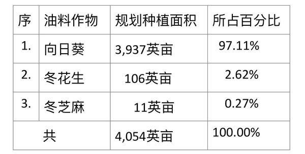 县区方面在去年冬季期间种植了各种油料作物3,416英亩,在今年即将到来的冬作物种植季节期间则规划种植向日葵、花生及芝麻等油料作物共4,054英亩。各种油料作物规划种植面积如下表: