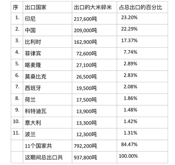 出口最多的这11个国家中,向印尼及中国出口的大米都占大米总出口的五分之一以上的比例,向比利时出口占总大米出口的六分之一以上的比例。除这三个国家外,向其他国家出口的大米都在10万吨以下了。