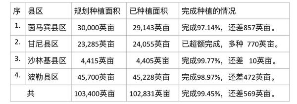 各县区目前几乎都完成了有关规划种植面积,甘尼县区甚至已超额完成了规划种植面积。