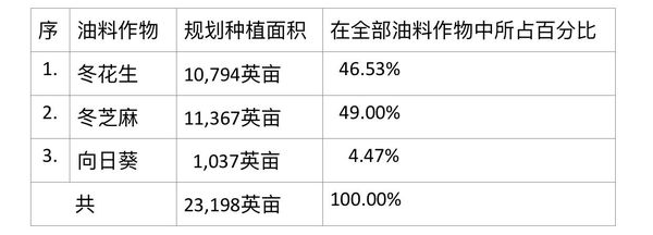 3种油料作物中,冬花生及冬芝麻种植面积都在1万英亩以上,两者的种植面积就占了全部油料作物种植面积95%以上的比例,而向日葵种植面积不到全部种植面积的5%。