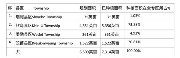 在现在的2024—25财政年度雨作物种植季节期间,瑞帽专区规划种植甘蔗作物6,509英亩,自5月份开始有关种植工作,到9月份时在专区内的4个县区分县区种植了此甘蔗作物7,314英亩,超过规划面积805英亩。各县区分县区规划种植面积与目前完成的种植面积如下表: